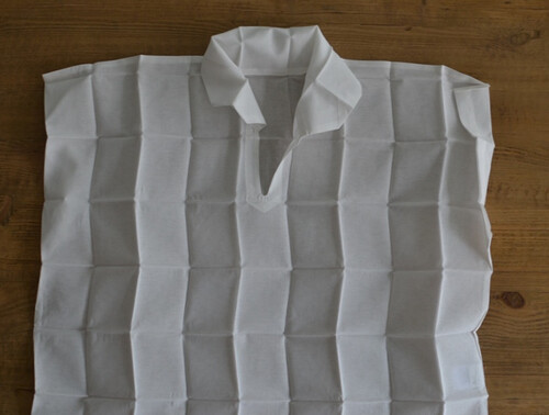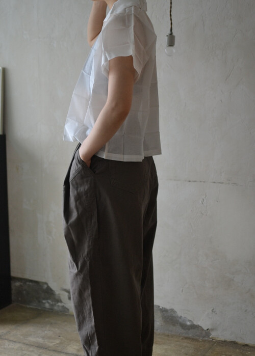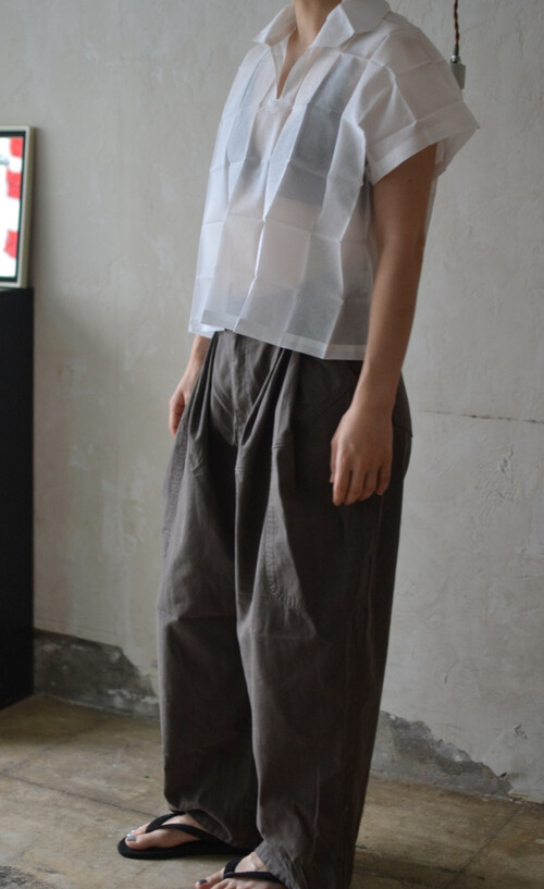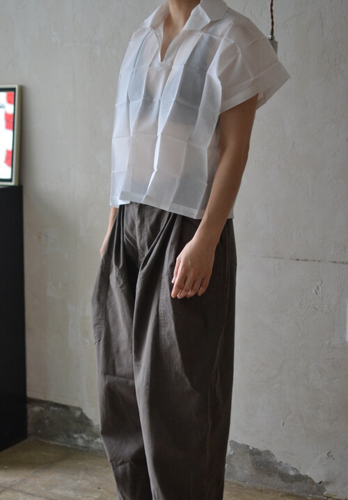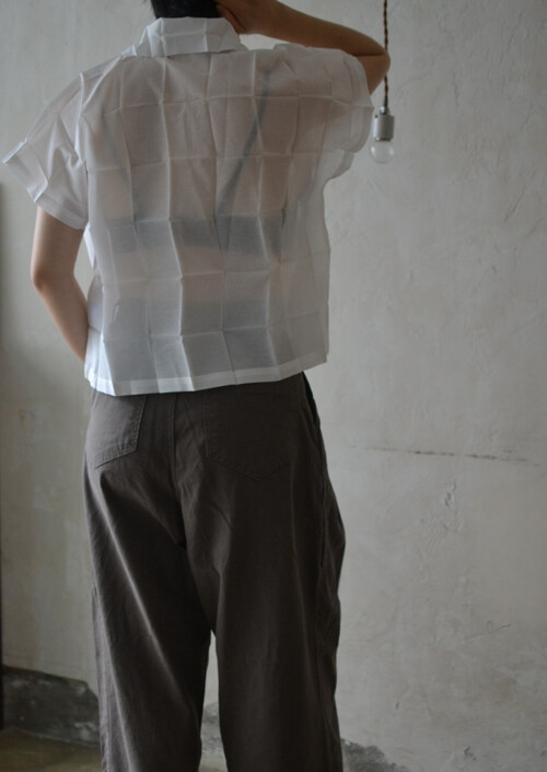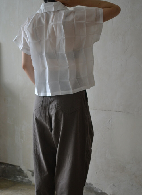 가볍고 통기성 좋은 고밀도 코튼 소재 카라와 브이넥 디자인으로 시원하고 세련된 무드 구조적인 패턴과 직사각 큐브형 압축 주름 디테일이 돋보임 심플하지만 미야케 특유의 감각적인 실루엣 상태 최상급