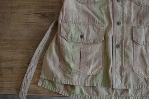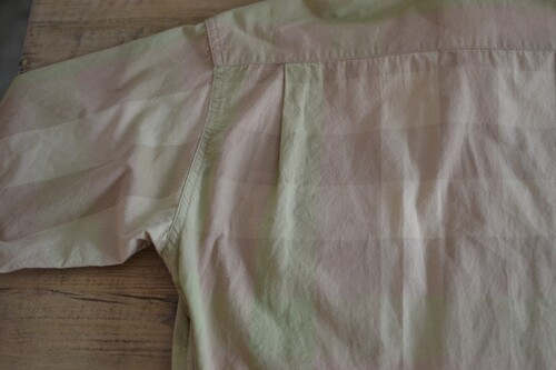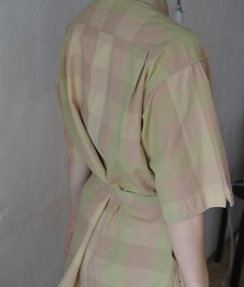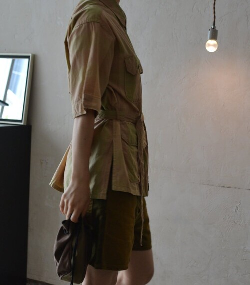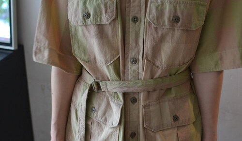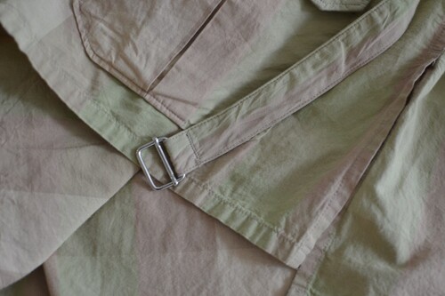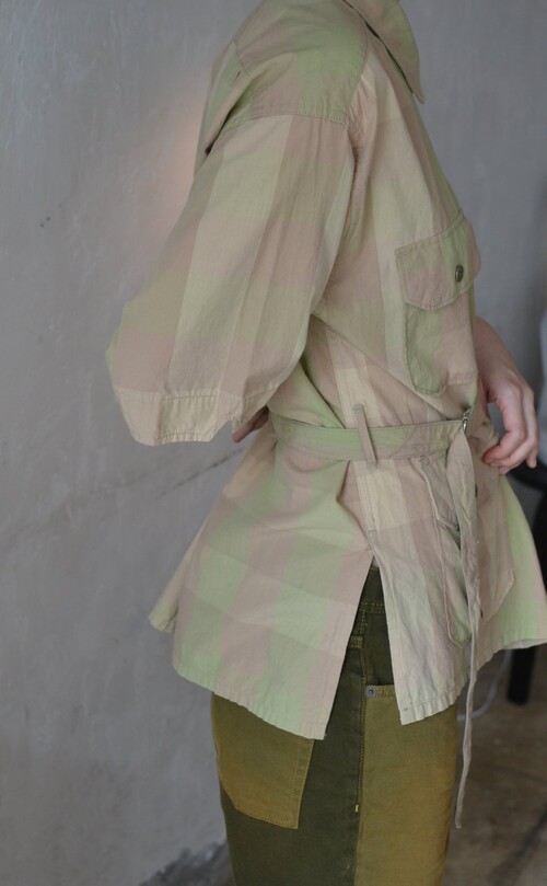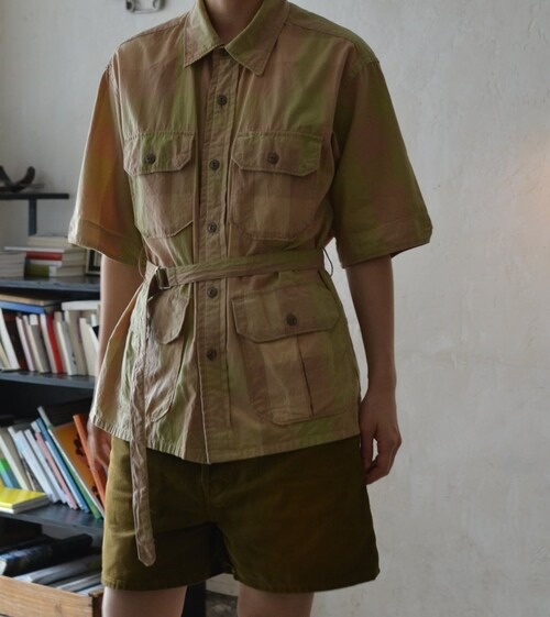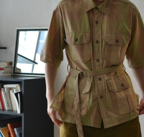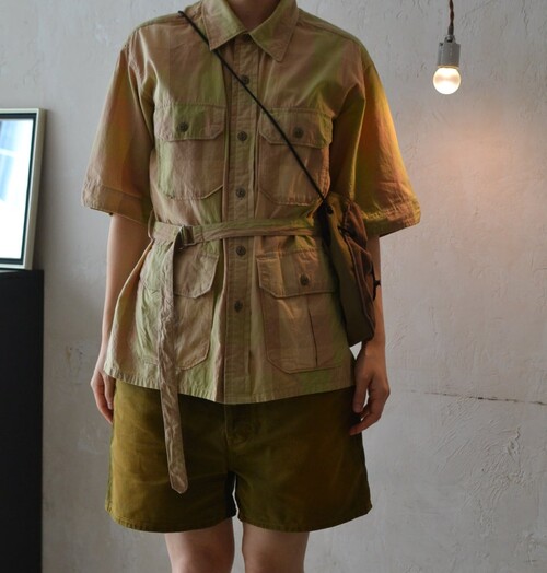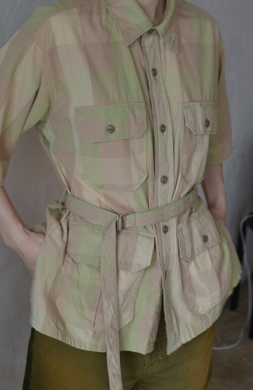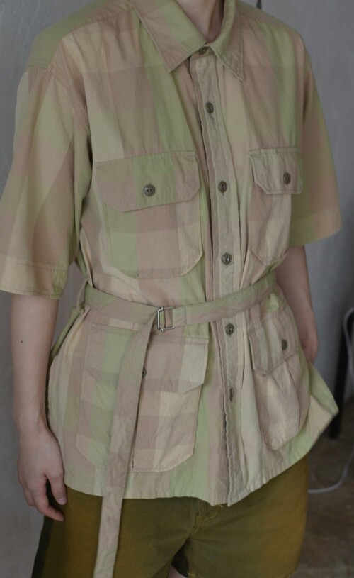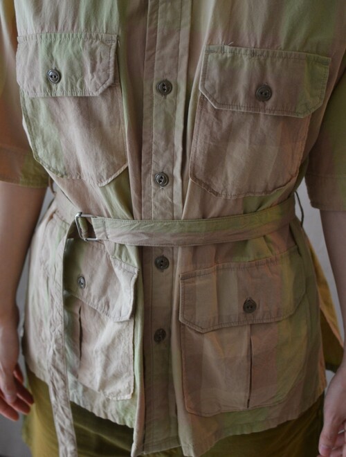 옅은 피그먼트 워싱 느낌의 베이지 올리브 체크 패턴이 매력적인 셔츠입니다 사파리 재킷 같은 셔츠입니다. 많은 디테일이 숨어있어요 실용적인 디자인이 매력적입니다.