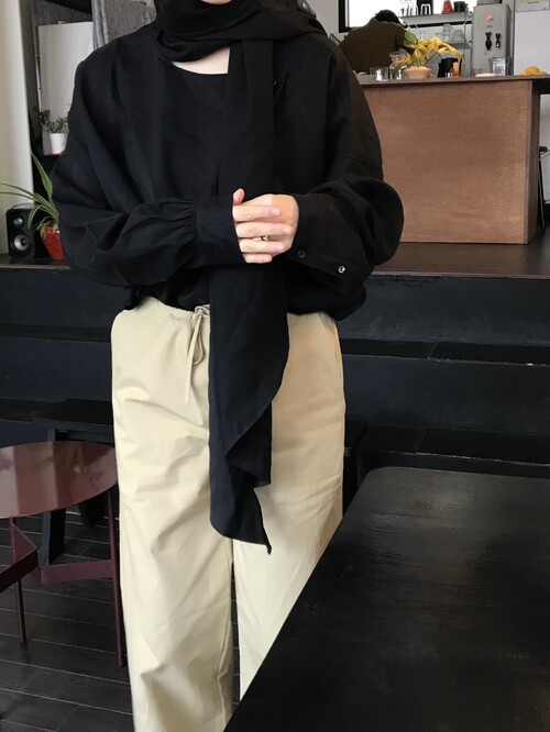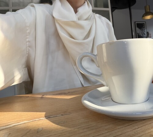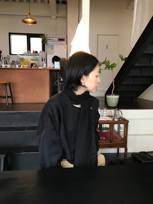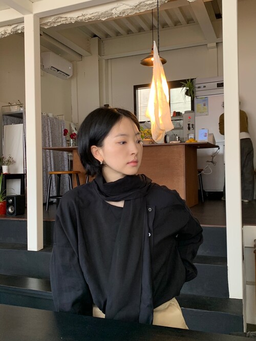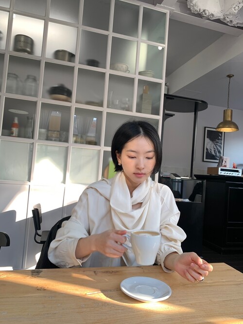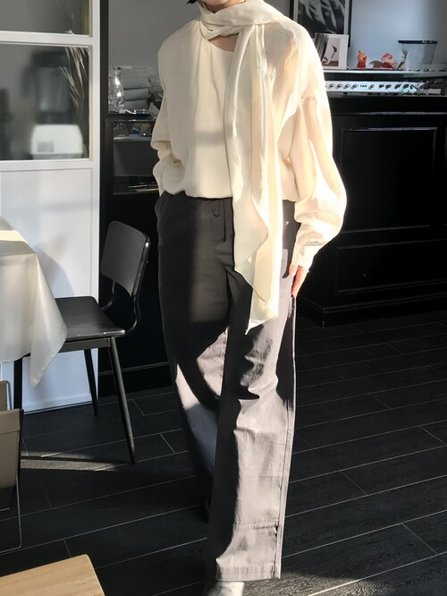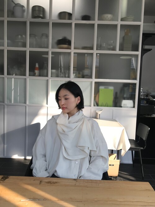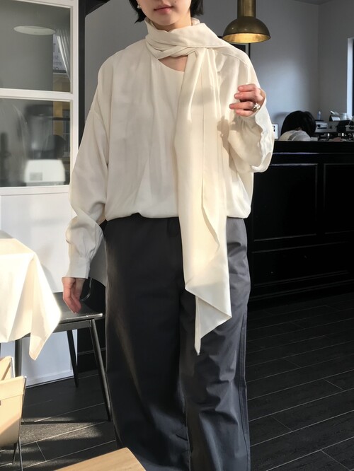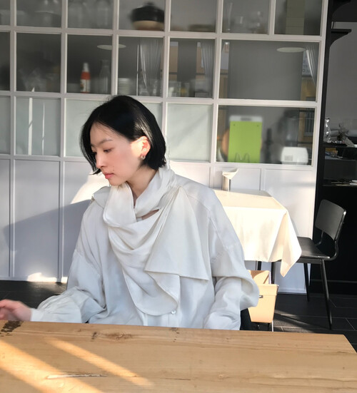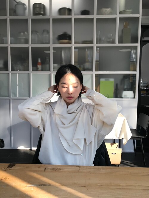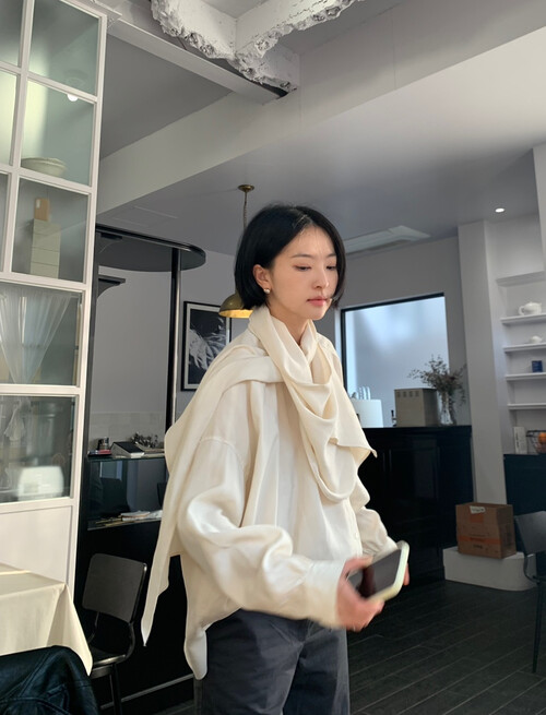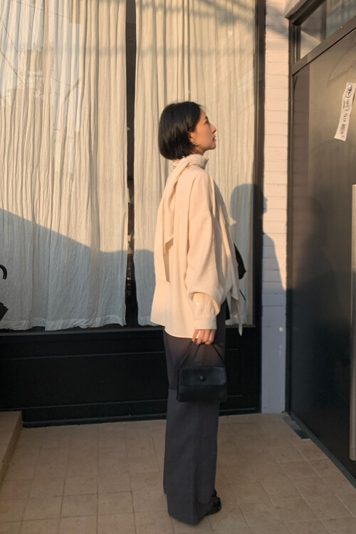 넥 라인을 따라 자연스럽게 떨어지는 스카프 디테일이 포인트로, 별도의 스타일링 없이도 충분히 분위기를 완성해 줘요.