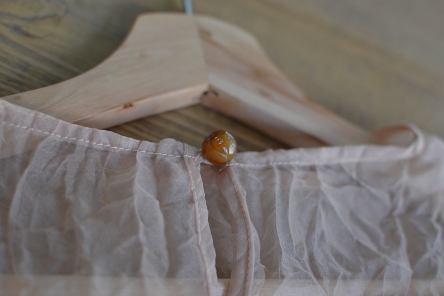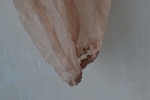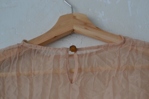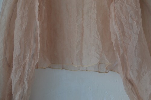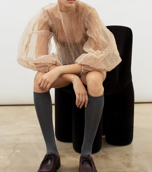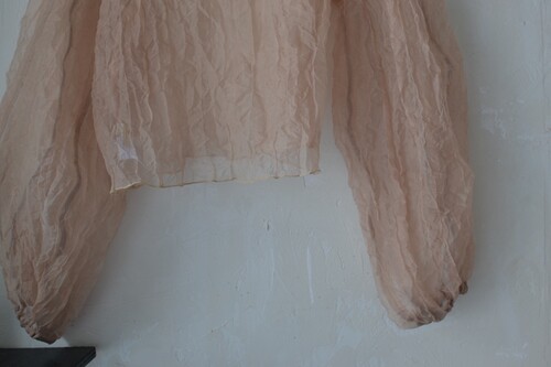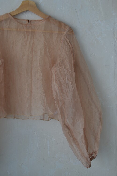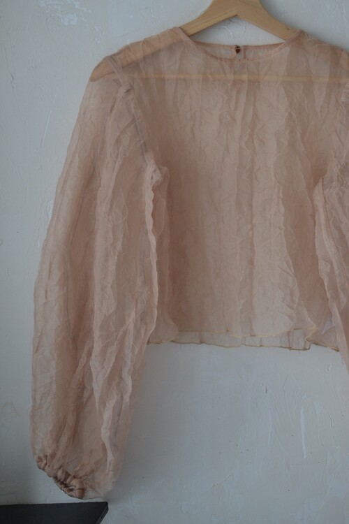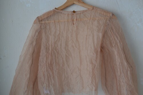 가볍고 은은한 광택이 있는 오간자 원단의 블라우스입니다. 투명한 질감이 특징이에요 견고하고 흐물거리지 않고 형태가 살아있는 우아한 핏입니다. 볼륨감 있는 소매나 뒤편 장미 단추 디테일이 아름다워요.