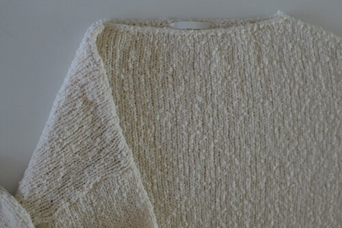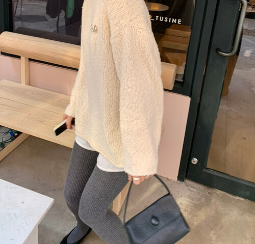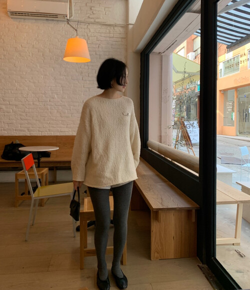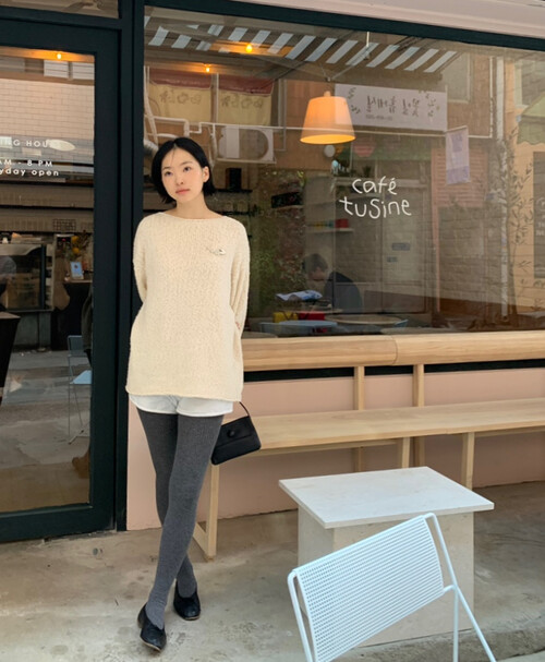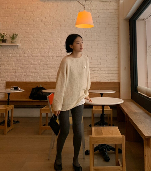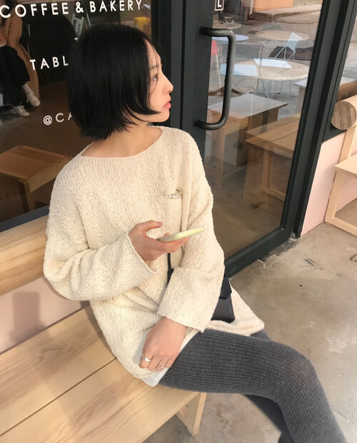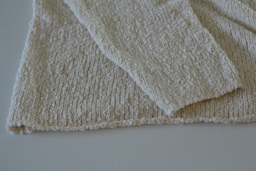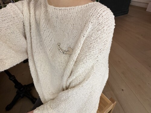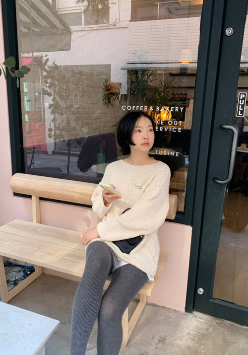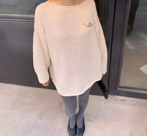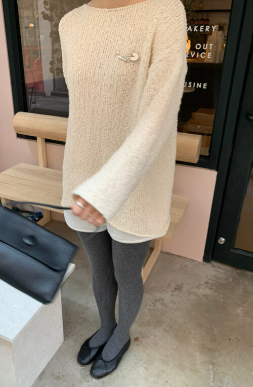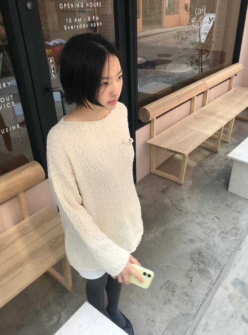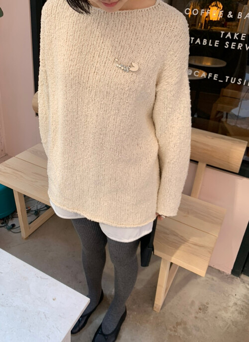 은은한 아이보리 컬러와 고급스러운 부클 텍스처가 돋보이는 루즈핏 니트입니다.